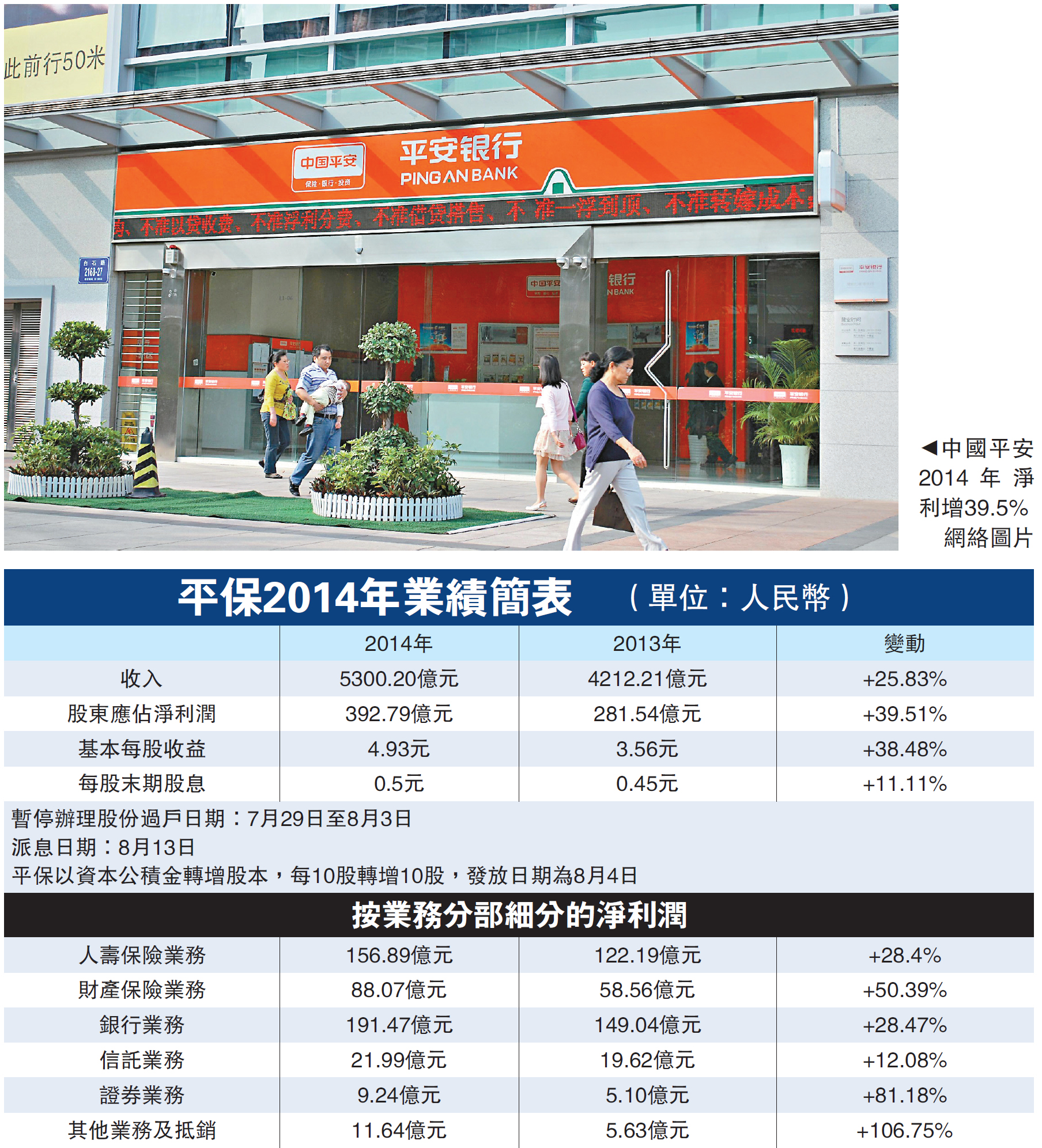 2014年为中国平安(02318)上市十周年,亦是集团业务丰收的一年。受惠于保险、银行及投资三大业务增长强劲,加上业务间的客户迁徙效果显著,平保昨日公布2014年全年纯利增长四成至392.79亿元(人民币,下同),符合市场预期。集团派每股末期股息0.5元,令全年股息合共0.75元,按年增加15.38%。此外,平保宣布以资本公积金转增股本,每10股转增10股,涉资91.40亿元。