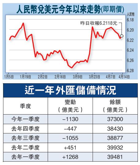 中国外汇储备连续三个季度下跌。今年首季内地外汇储备由去年四季度末的3.843万亿美元降至3.73万亿美元,环比减少1130亿美元,创有纪录最大降幅。市场认为,这除了是今年首季欧元兑美元下跌,也与近几个月央行干预外汇市场有关。