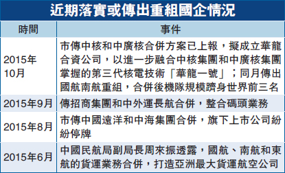 事实上,紧随南车和北车合併成中国中车后,中电投与国核电也已合併,成为最大核电公司国家电力投资集团,资产规模超过7000亿元人民币。市场人士分析指出,中国已进入国企整合高峰期,当中,核电、航空、航运、军工和铁路等五大行业的重组预期最高。