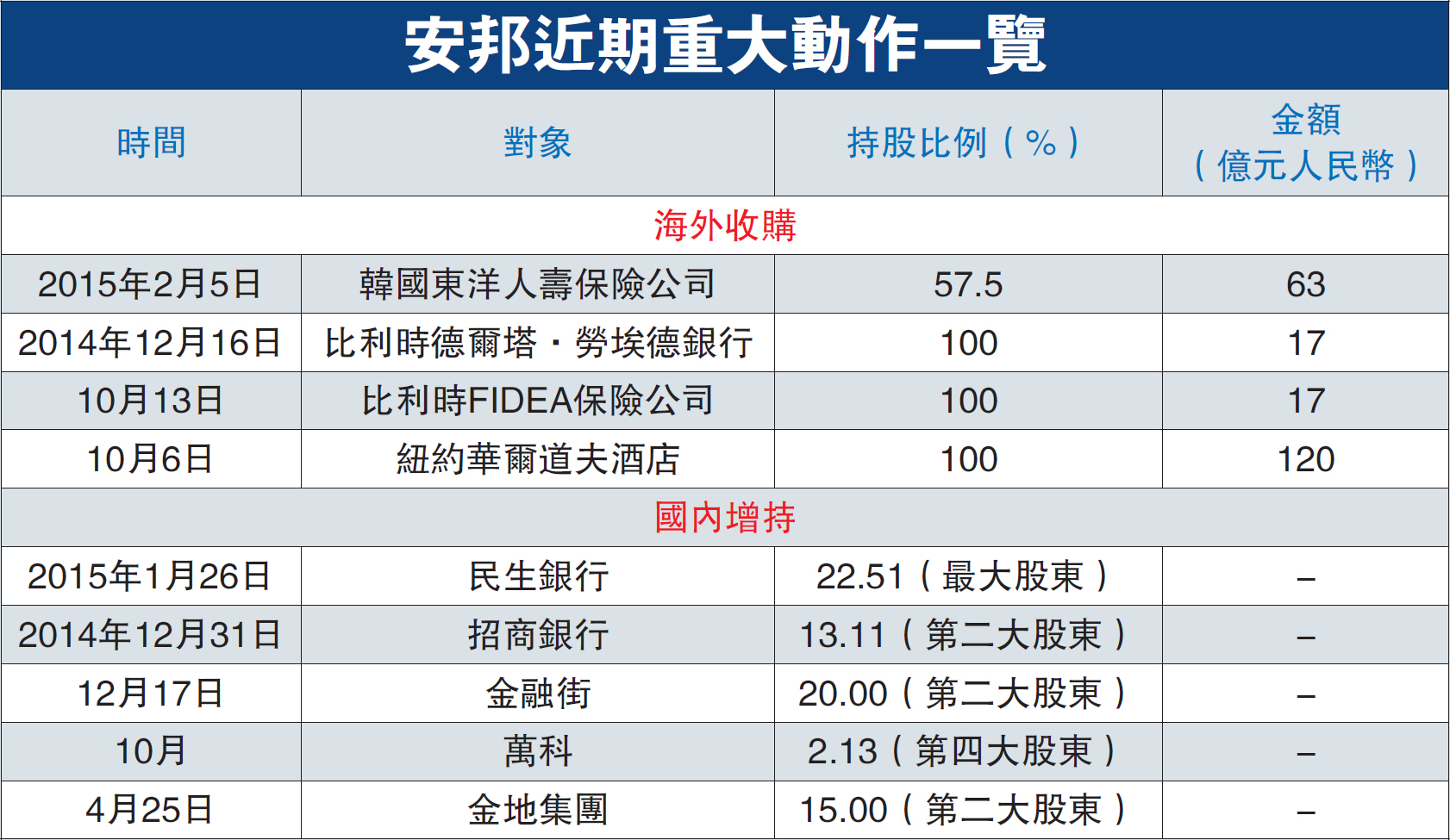自去年开始,安邦开始在海外密集“扫货”,先是10月份相继收购纽约华尔道夫酒店和比利时FIDEA保险公司,随后12月又入主比利时德尔塔.劳埃德银行,且全部为100%控股。而这还只是安邦海外布局的一个序幕。