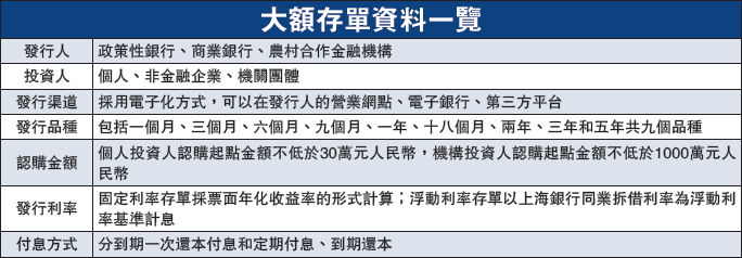 中国利率市场化再下一城。中国央行昨日宣布,推出大额存单产品,投资人包括个人、非金融企业等,投资门槛分别为30万元(人民币,下同)和1000万,利率则採用固定及浮动两种方式,并可转让、提前支取和赎回。分析人士表示,大额存单作为银行主动负债管理工具,其推出意味?银行负债端自主定价能力增强,全面的利率市场化只差放开存款利率“临门一脚”。