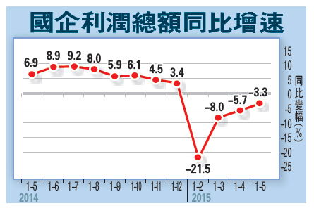 财政部表示,今年以来国有企业利润降幅持续放缓。首一至二月、一至三月、一至四月分别跌21.5%、8%及5.7%,据此,今年前五个的降幅分别收窄18.2、4.7和2.4个百分点。财政部分析称,上月受惠高成本库存逐步消化、原油和天然气销售量价齐升等因素,中石油等三大石油公司实现利润环比增长32.8%至306.7亿元;国有煤炭、钢铁、有色行业因费用降低及投资收益增加等因素,实现利润环比增长254.8%至27.4亿元。