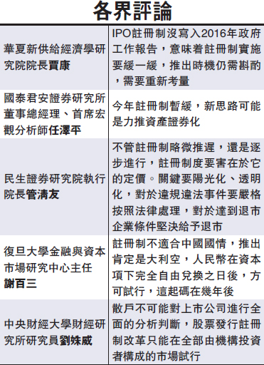 今年的政府工作報告在涉及“資本市場”的部分,提到推進股票、債券市場改革和法治化建設,促進多層次資本市場健康發展,提高直接融資比重。但未有如去年提出“實施股票發行註冊制改革”的相關內容。著名經濟學家、華夏新供給經濟學研究院院長賈康認為,這意味註冊制實施要緩一緩,推出時機仍需斟酌,需要重新考量。國泰君安證券研究所董事總經理、首席宏觀分析師任澤平認為,今年註冊制暫緩,新思路可能是力推資產證券化。