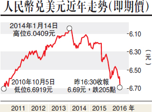 国际市场汇价大幅波动,中国央行昨日再大幅调低人民币兑美元中间价263点至6.6857元,在岸人民币汇率也跟随中间价走势盘中曾跌破6.69元关,中间价、在岸价同创逾五年半新低。中国外汇交易中心就近期人民币走贬解释,阶段性的外汇需求旺盛及英国“脱欧”公投导致全球外汇市场动盪,但强调人民币总体上对一篮子货币汇率保持基本稳定,市场预期也较为平稳。
