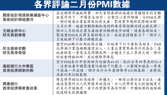 随着经济总需求的改善,中国官方製造业採购经理人指数(PMI)改变了连续四个月的下跌势头。国家统计局昨日公布,上月製造业PMI环比回升0.1个百分点至49.9%,惟仍连续两个月处于荣枯线以下。分析认为,数据微升主要受到近期降准、减税等政策推动,随着春节结束和开工旺季来临,3月PMI还会继续回升;在政策的持续发力下,经济增速料得到改善。